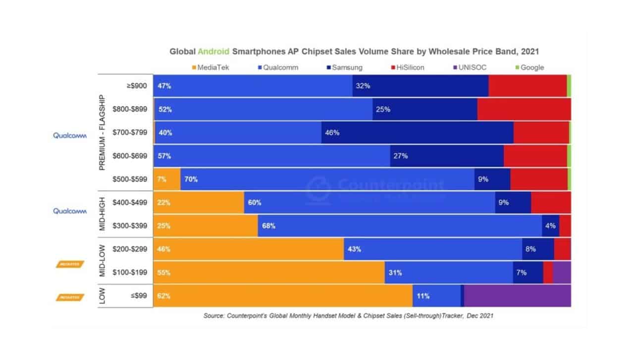 去年,高通將重點放在Snapdragon 7xx和8xx系列上。通過綁定射頻前端模塊,超聲指紋識別和快速充電方案,他們在中部-499 USD MID -HIGH -HIGH -END手機市場中取得了出色的成績。 2020年53增加到68。至於旗艦手機市場超過500美元,Snapdragon 888和Snapdragon 8 Gen 1將高通公司的市場份額從41增加到55。